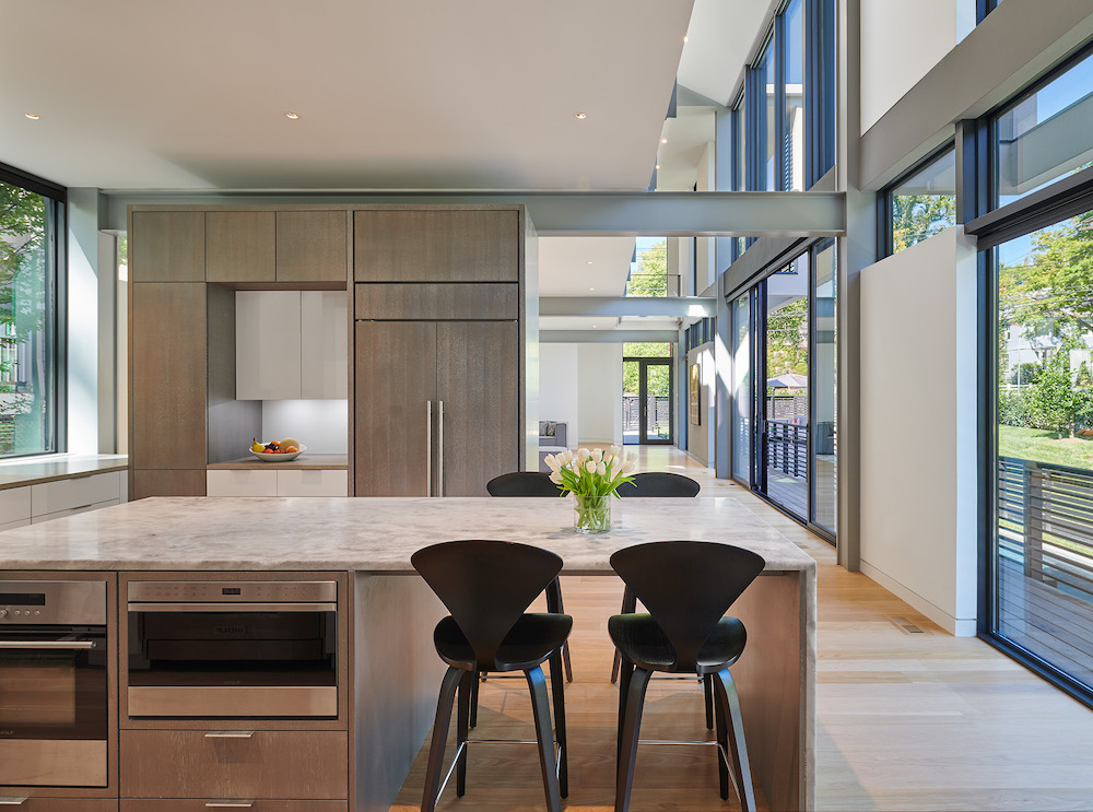 On a corner lot in a leafy neighborhood in Washington DC, the long thin shape of this house occupies every legal inch of the site — front, back, and sides.
