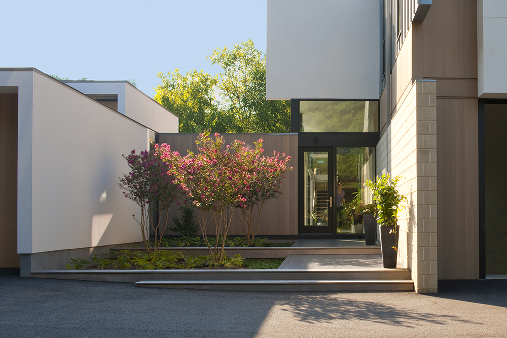This new house outside of Baltimore is sited on a gently sloping meadow and set back from its neighbors. The house is long and thin to bring in light and air from both sides, and to open to the meadow on one side and a pool courtyard on the other, providing the sunny sites for family sports that our clients requested. The main living area opens to these outdoor spaces and becomes an extension of both. Dressed stone, zinc, bleached cedar and integrally colored white stucco are woven together on the exterior and interior to further blur the distinction between inside and outside.
