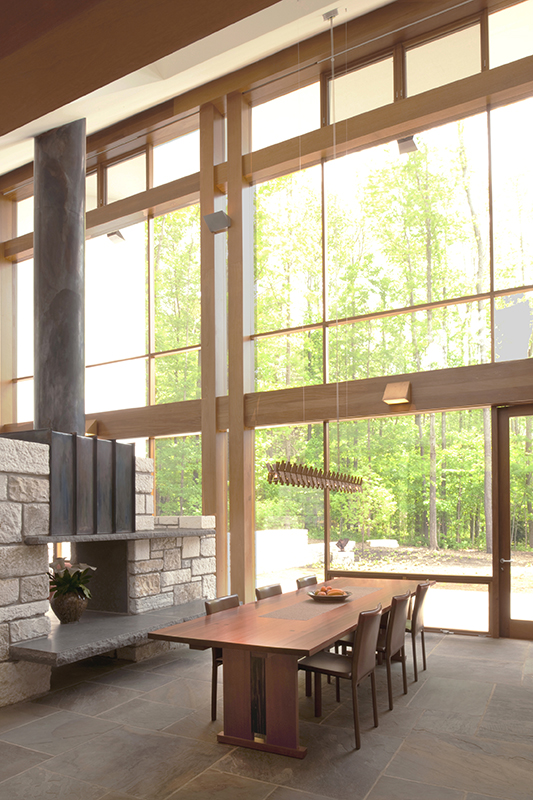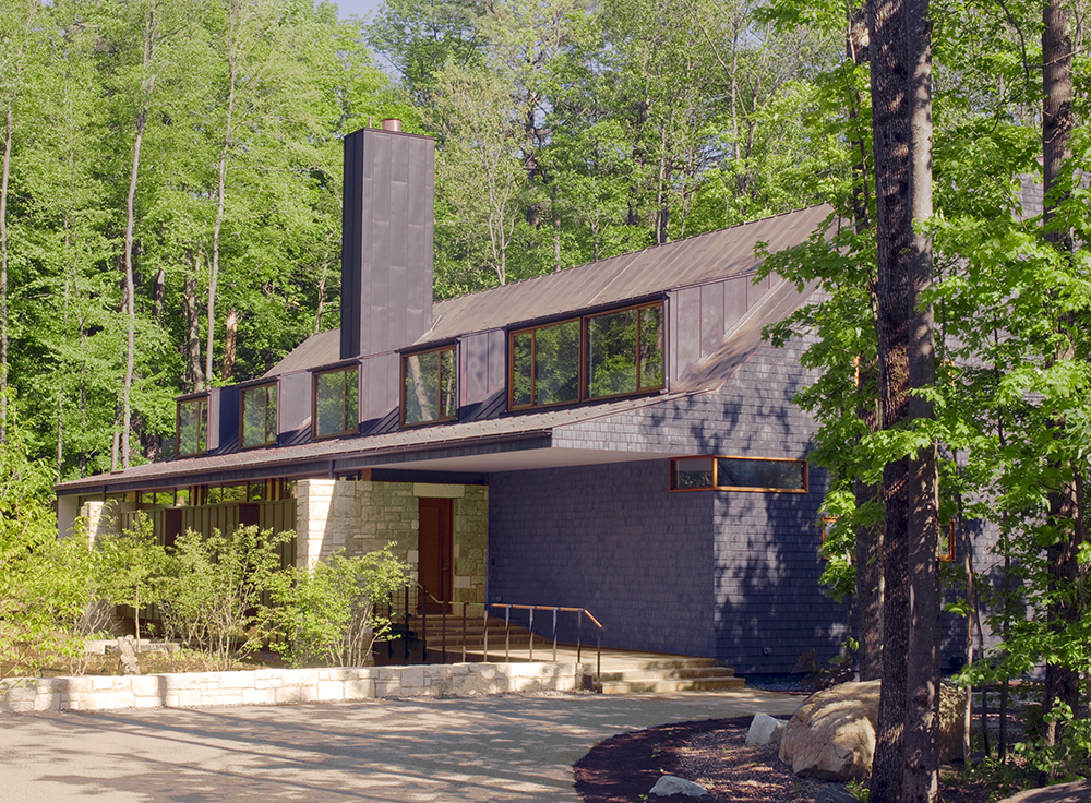 This house in the Berkshires engages its wooded site through terraced gardens, a large south-facing porch and a wall of glass. The garden walls are to be built with stone salvaged from the foundations of nearby ruin, and extend from the site through the house, organizing the interior spaces along the way. The simple form of the house, clad in copper, cedar shingles and with mahogany-framed windows, connects the house to equally simple New England precedents.