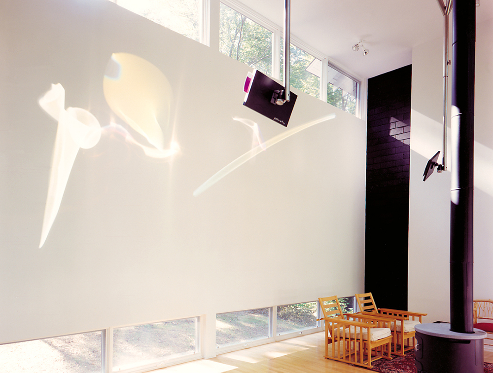 The cabin exists in the two asphalt-shingled, tightly functional wings. Saad Cook is in the middle, in a metal and glass room that bridges the wings. This space, which houses the living and dining areas, is designed around this piece. Here, the sun drawing projects reflected images, which change with the movement of the sun and clouds, onto a wall-an ephemeral response to place, time and architecture. The glass wall is to the north, and the second-story bridge that connects the two wings runs in front of it. This allows the south wall to receive the projected image on a billboard-like surface, which itself allows south light in only at the floor and ceiling